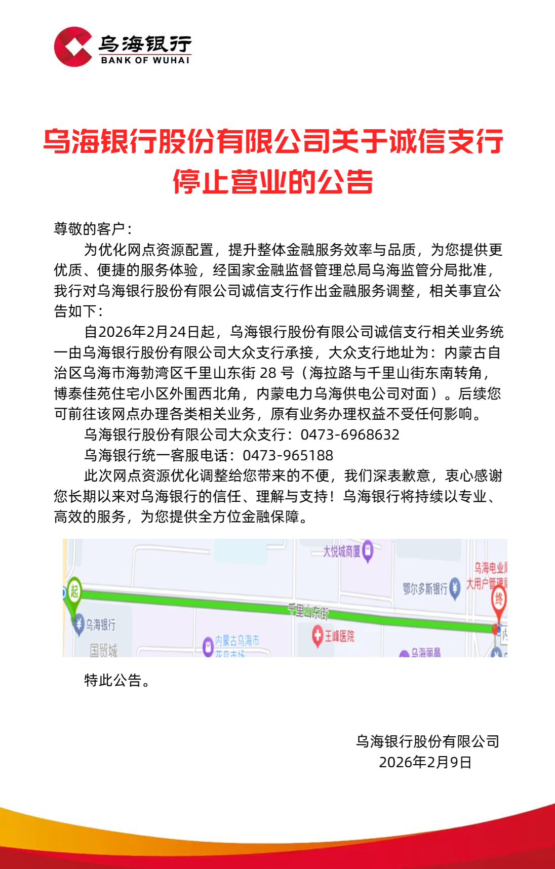 乌海银行股份有限公司关于诚信支行停止营业的公告