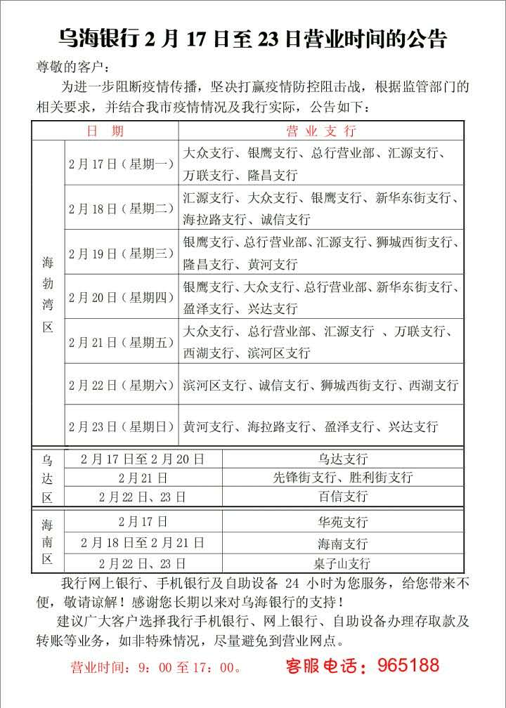 乌海银行2月17日至23日营业时间的公告